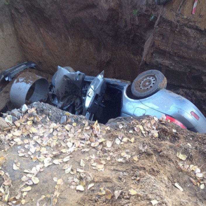 Автомобиль залетел в вырытую коммунальщиками двухметровую яму