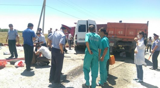 Напомним, ДТП произошло на трассе Алматы - Шымкент в районе кольцевой дороги "Боз Арык". Сигнал на пульт дежурного ДВД поступил ориентировочно в 12.30. "Столкнулись автомашина Mercedes Sprinter с грузовиком Howo. По предварительным данным, на месте ДТП погибли шесть человек. Также несколько человек получили травмы различной степени, их количество пока не установлено. Сейчас на место выехали группа ДВД, ЧС, медики", - сообщила пресс-секретарь ДВД ЮКО Салтанат Каракозова. Сейчас сотрудники полиции выясняют причины ДТП.