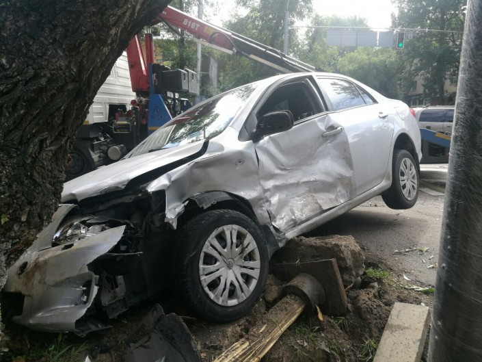 Со слов очевидцев, следуя по улице Курмангазы, Toyota на зеленый свет начала пересекать Желтоксан. В этот момент ей в бок врезался Nissan, который ехал вниз по односторонней улице. Toyota закрутило и отбросило на светофорный столб.