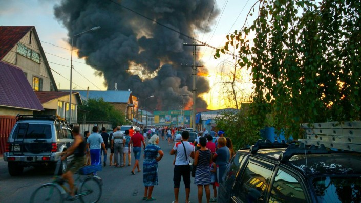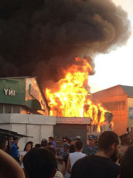 Как сообщается, пожар в ТЦ "Болашак" и "Мир обуви" произошел в 18.55. Площадь возгорания составила 2,5 тысячи квадратных метров. В ликвидации пожара были задействованы 80 человек личного состава ДЧС, а также противопожарная техника и машины коммунальных служб города. Кроме того, для обеспечения порядка и пресечения попыток мародерства были привлечены 500 полицейских и солдат внутренних войск.