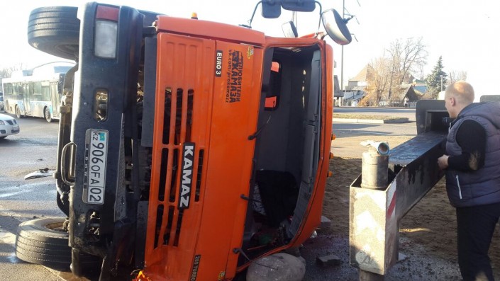 Груженый песчано-гравийной смесью "КамАЗ" и Lаda Kаlina двигались по проспекту Рыскулова в восточном направлении. По неизвестным причинам произошло столкновение большегруза и легкового авто. По всей видимости, от удара "КамАЗ" опрокинулся и содержимое кузова высыпалось на асфальт.
