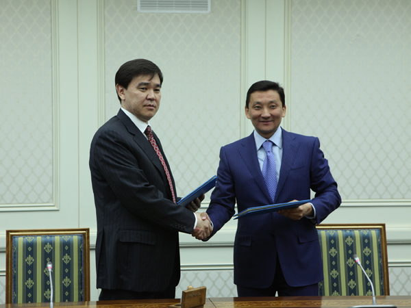 Канат Султанбеков на должности замакима Астаны и на тот момент председатель правления АО "Казпочта" Аркен Арыстанов. 4 июля 2013 год. Фото astana.gov.kz