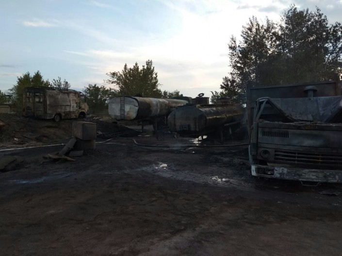 "Сообщение о пожаре поступило в 18 часов 22 минуты. На улице Химкобинатовская на территории автостоянки для грузовых автомобилей горел полуприцеп бензовоза. Огонь перекинулся на рядом стоящий бортовой КамАЗ. Пожар локализован и ликвидирован в 19 часов 15 минут", - сообщили в пресс-службе ДЧС Павлодарской области.