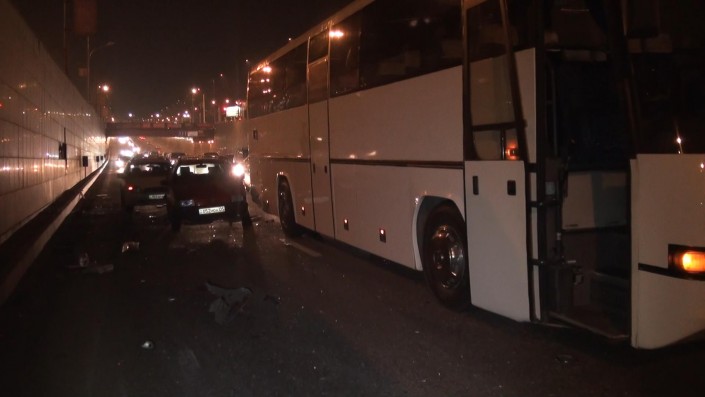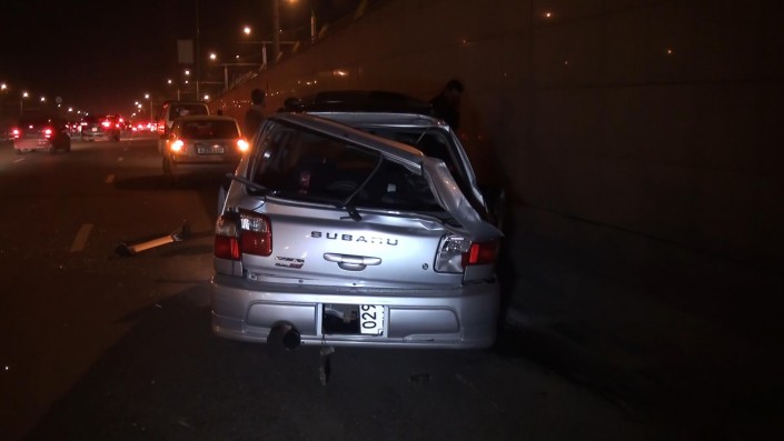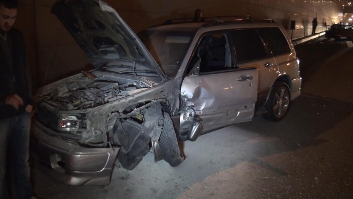 Буквально через 30 минут также на улице Саина из-за пробки, образовавшейся из-за предыдущей аварии, произошло еще одно ДТП. На север по Саина двигались автобус, Volkswagen Passat, Subaru Outback и Subaru Forester. По словам очевидцев, водители автобуса, Volkswagen Passat и Subaru Outback остановились из-за образовавшейся пробки, а водитель Subaru Forester не заметил ее и на высокой скорости, пытаясь избежать ДТП, взял правее и в итоге пролетел между Volkswagen и туннелем развязки, влетел в туннель и перевернулся. Volkswagen и Subaru Outback после удара врезались в автобус. В результате аварии пострадал пассажир Subaru Forester.
