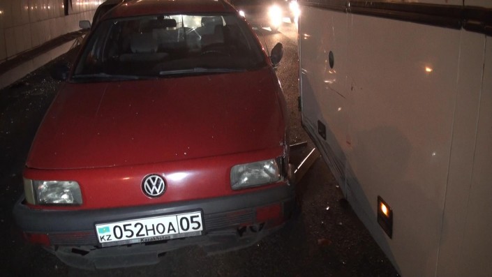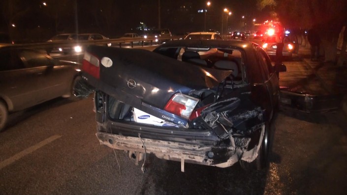Первая авария произошла по улице Саина, не доезжая до улицы Улугбека. Столкнулись автомобили Opel и Toyota Camry, которые двигались в северном направлении. Как сообщили очевидцы ДТП, водитель Opel не справился с управлением и врезался в разделительное ограждение, после чего отлетел в Toyota Camry. В результате столкновения никто не пострадал.