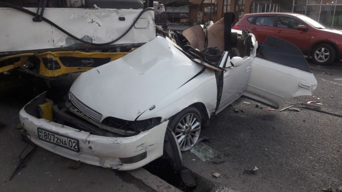 Водитель легкового автомобиля скончался после столкновения с автобусом в Алматы, сообщает корреспондент программы "Территория происшествий" на канале СТВ.