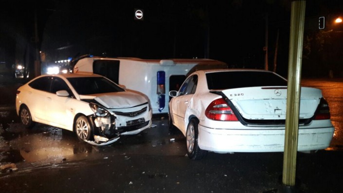 Со слов очевидцев, авто специальной медицинской помощи двигалось на вызов по улице Желтоксан в северном направлении. В этот момент в восточном направлении по Макатаева, проигнорировав или не заметив знак "Уступи дорогу", Mercedes выскочил на перекресток. Карета скорой помощи ударила Mercedes и от удара перевернулась на бок и отлетела к авто марки Hyundai Accent, которая стояла на светофоре в западном направлении по Макатаева, пропуская машину скорой помощи.