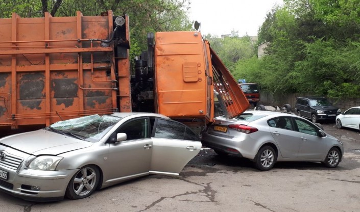 ДТП произошло во дворе по улице Сатпаева, между проспектами Достык и Назарбаева. Как рассказал водитель мусоровоза, он подъехал к мусорным контейнерам, однако не смог проехать из-за припаркованных автомобилей. Водитель поставил грузовик на ручник и вышел из салона, чтобы попросить владельцев убрать свои машины. Но их на месте не оказалось. В этот момент КамАЗ "сорвался" с ручника и врезался в Toyota Corolla. Она в свою очередь задела рядом припаркованный Rav-4 и перевернулась.