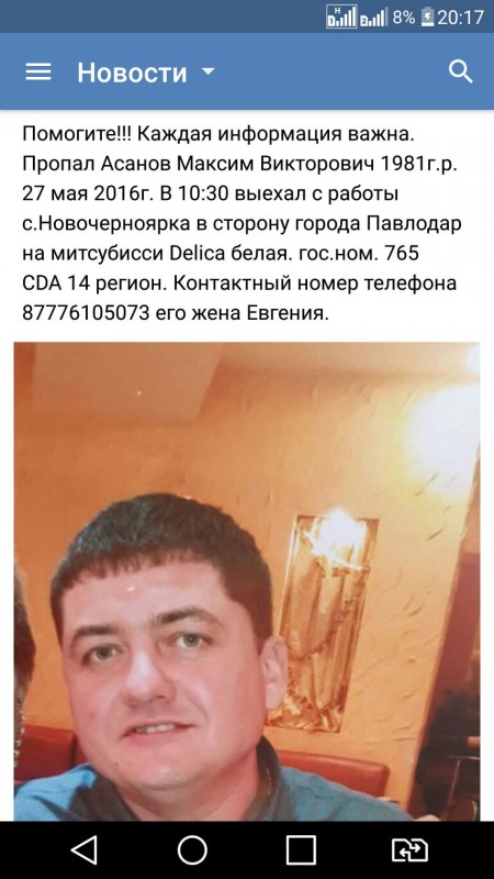 Известно что 27 мая в 10:30 на белой Mitsubishi Delika мужчина 1981 года рождения выехал в сторону Павлодара из села Новочерноярка. Был одет в рабочую одежду: черные кросовки, темную футболку, темно-зеленую жилетку и кепку. Камера наружного наблюдения зафиксировала такую же машину на выезде из села. Но домой мужчина так и не вернулся.
