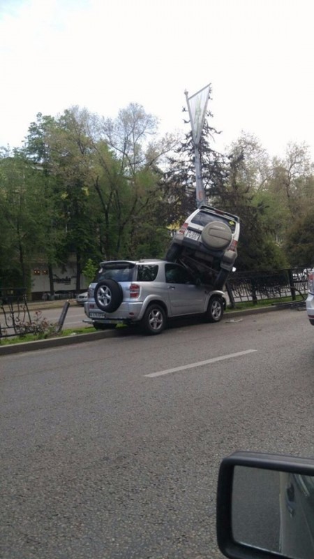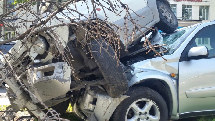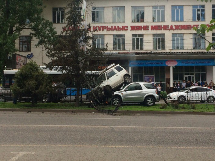 Последствия аварии на пересечении проспекта Абая с улицей Фурманова засняли очевидцы. Одна автомашина оказалась на другой, проломив железное ограждение.