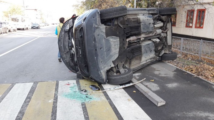 Nissan Qashqai перевернулся от удара Volkswagen Golf на перекрестке в Алматы, передает корреспондент программы "Территория происшествий" на телеканале СТВ.