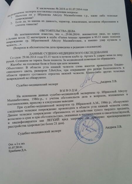 По словам Ибрашовой, результаты ей передал следователь 8 июля. Согласно документу, "при судебно-медицинской экспертизе обнаружено следующее телесное повреждение: кровоподтек в области угла нижней челюсти слева. Данное телесное повреждение образовалось от воздействия тупого твердого предмета, возможно в срок и при обстоятельствах, указанных в постановлении и свидетельствуемой, и квалифицируется, как легкий вред здоровью по критерию кратковременного расстройства здоровья".