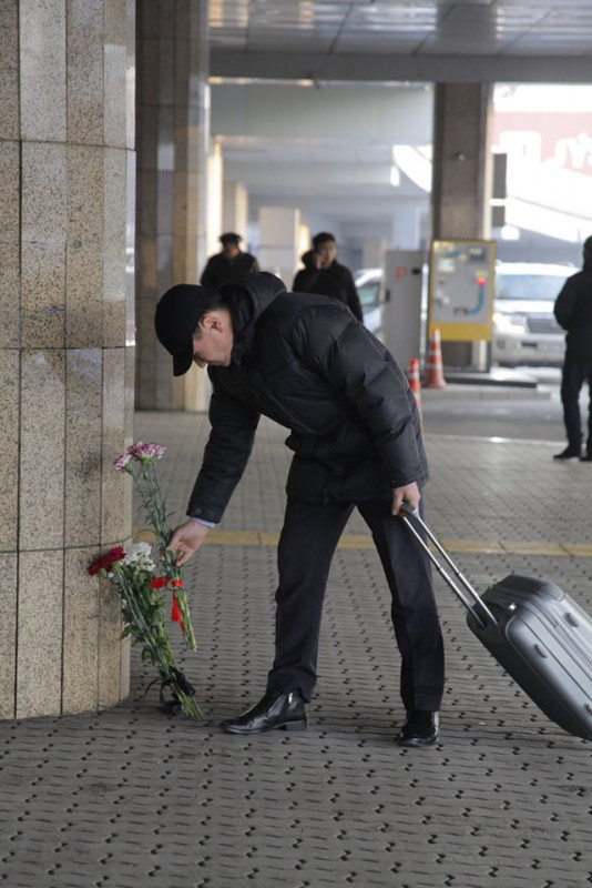18.28 Люди несут цветы к зданию аэропорта Алматы.