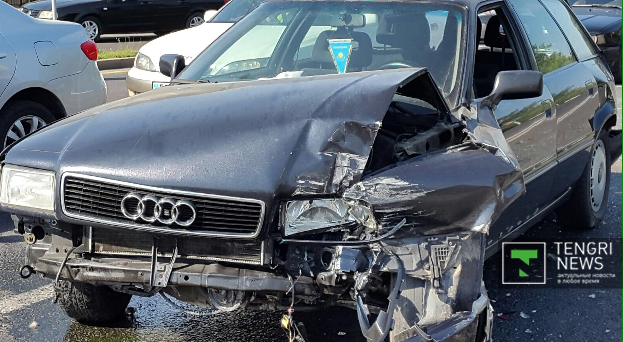 После столкновения с Audi автобус пересек улицу Саина, снес разделительное ограждение, вылетел на встречную полосу движения, затем врезался в цветочную аллею, снеся бордюры. Затем, перелетев через арык, автобус врезался в опору моста развязки, едва не упав в тоннель.