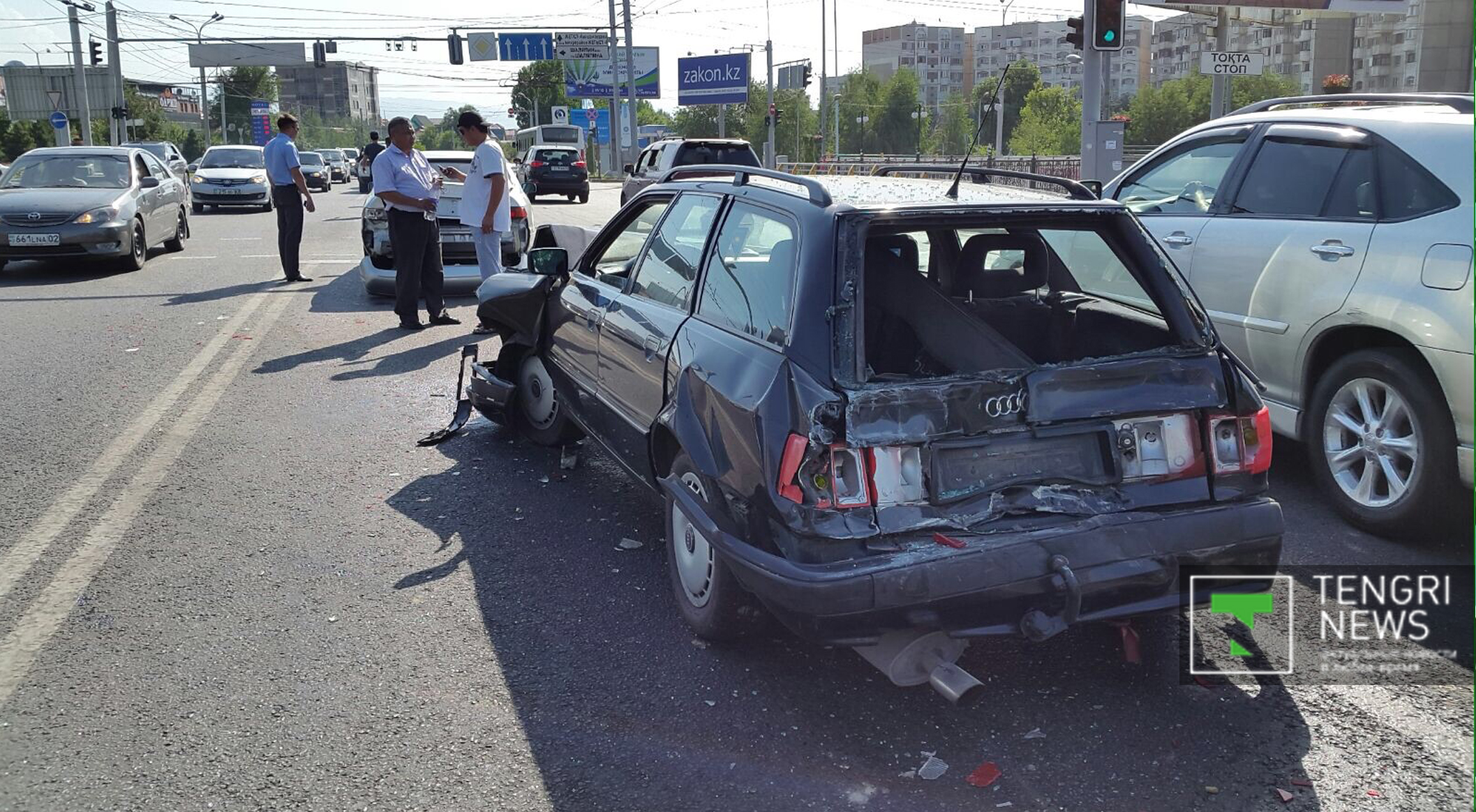 Инцидент произошел на пересечении проспекта Абая и улицы Саина. Автобус №92 двигался по проспекту Абая в западном направлении. На перекрестке он врезался в автомобиль Audi, который затем столкнулся с Volkswagen Touareg, а тот, в свою очередь, по инерции задел автомобиль Toyota Camry.