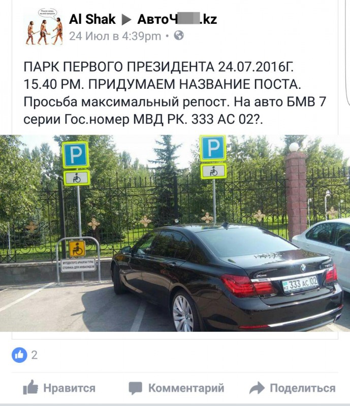 В полиции прокомментировали фото с BMW на парковке для инвалидов в парке Первого Президента в Алматы, сообщает корреспондент Tengrinews.kz.