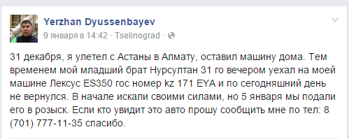 Как пояснили корреспонденту в пресс-службе столичного ДВД, 5 января этого года житель Астаны обратился с заявлением о том, что 31 декабря, около 20.00, его 23-летний брат уехал из дома на автомобиле Lexus и не вернулся. На установление местонахождения пропавшего ориентирован весь личный состав ДВД Астаны, Алматы и областей.
