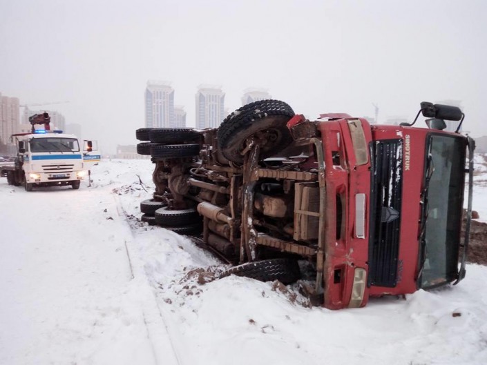 В Facebook на странице Ұлана Әбішева появились фотографии ДТП на улице Нажимеденова в Астане. Столкнулись китайский самосвал Sinotruk Howo и автомобиль KIA. В результате оба транспорта перевернулись.