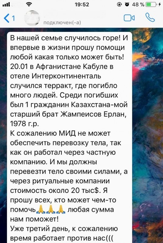 По его словам, компания, которая занимается транспортировкой тела, изначально запросила 20 тысяч долларов. Казахстанские дипломаты смогли найти другую компанию, которая пошла навстречу и согласилась вернуть тело погибшего на родину за 6-7 тысяч долларов.