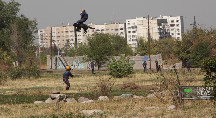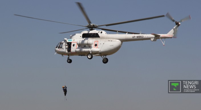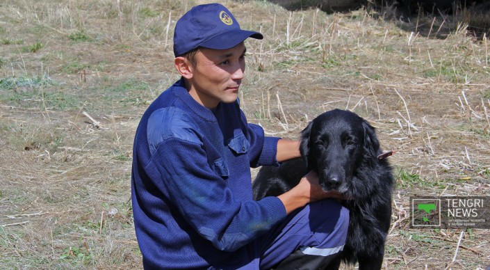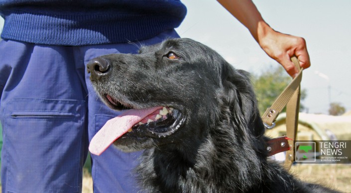 "Сотрудника" кинологической службы по кличке Париж спустили с вертолета. Как сообщил спасатель-кинолог Айдос Кулембеков, с псом он работает уже шесть лет. "Самое главное - наладить контакт между собакой и дрессировщиком. Если есть контакт, то она доверяет хозяину и не боится, что он упадет вместе с ней", - сказал он.