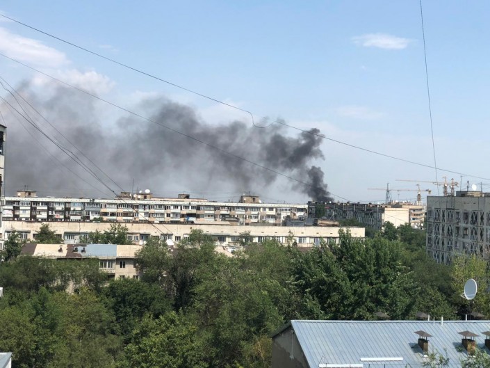 По словам очевидцев, проспект Назарбаева и близлежащие улицы затянуло дымом, сильно пахнет гарью.