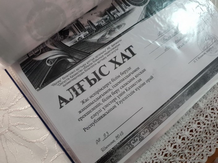 В фойе школы организовали уголок памяти. Рядом с фотографией Такирхана Абишева папка с многочисленными благодарственными письмами и грамотами за хорошую работу и победы в различных творческих конкурсах.