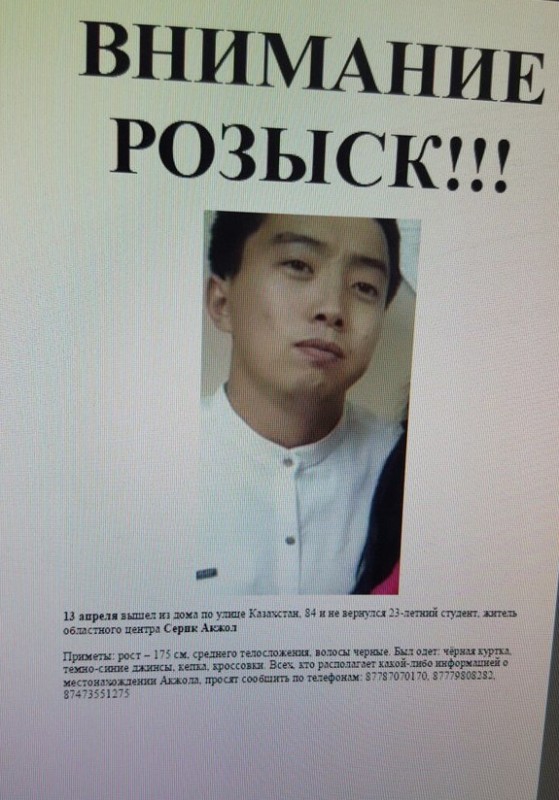 Как рассказала мама Акжола Гульнур Забиркызы, их семья несколько лет назад переехала из Китая. Сейчас молодой человек учится на филологическом факультете, подрабатывает в фармацевтической компании. 13 апреля студент должен был по работе отнести около 180 тысяч тенге своему начальнику. Тем же вечером его телефон перестал отвечать. Последний раз Акжола видели около ТД "Даниель".