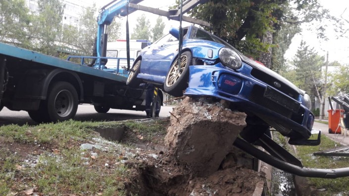 Автомашина Subaru снесла рекламный билборд в Алматы, сообщает корреспондент программы "Территория происшествий" на телеканале СТВ.