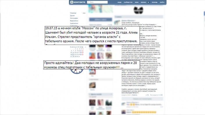 "19.07.15 в ночном клубе "Moscow" по улице Аскарова в Шымкенте был убит молодой человек в возрасте 21 года. Алиев Ильхам. Стрелял представитель "органов власти" из табельного оружия. После чего скрылся с места преступления", - написала на своей странице ВКонтакте девушка.