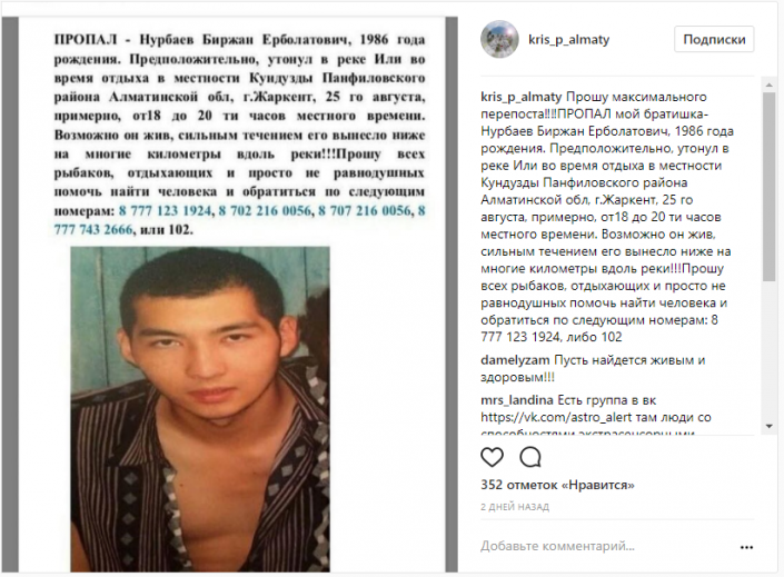"Пропал мой братишка - Нурбаев Биржан Ерболатович 1986 года рождения. Предположительно, утонул в реке Или во время отдыха в местности Кундузды Панфиловского района Алматинской области, город Жаркент, 25 августа, примерно от 18 до 20 часов местного времени. Возможно, он жив", - говорится в объявлении родных.