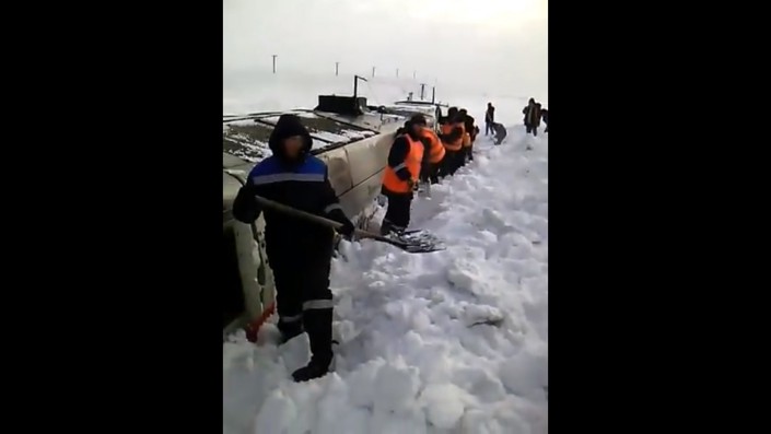 На железной дороге Алматы - Караганда тепловоз засыпало снегом почти по самую крышу. Очевидец запечатлел момент, когда рабочие прибыли освобождать поезд из снежного плена. Ролик опубликовал пользователь Серик Куатов на сайте YouTube.