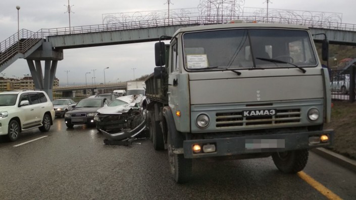 В Алматы легковой автомобиль Toyota Avalon врезался в стоящий на дороге КамАЗ, проводивший ремонтные работы, передает корреспондент программы "Территория происшествий" на канале СТВ.