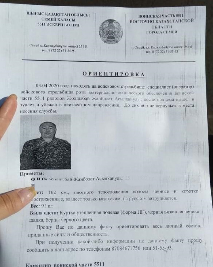 "3 апреля, находясь на воинском стрельбище, специалист (оператор) войскового стрельбища роты материально-технического обеспечения воинской части 5511, рядовой Жолдыбай Жанболат Асылханулы после подъема вышел в туалет и убежал в неизвестном направлении. До сих пор не вернулся в место несения службы", - говорится в распространяемой в Instagram ориентировке.