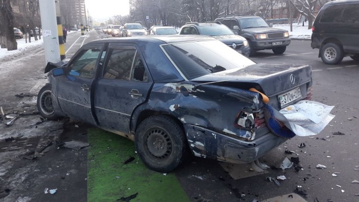 Немецкая иномарка, угнанная, как было установлено, в Бостандыкском районе, двигалась в северном направлении по улице Навои. Очевидцы рассказали, что на перекрестке с улицей Торайгырова автомобиль продолжил движение на красный сигнал светофора и в результате ударил Hyundai Santa Fe.