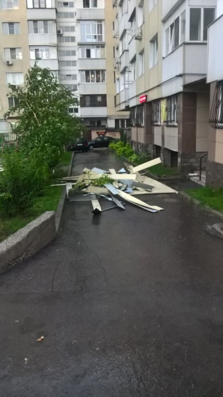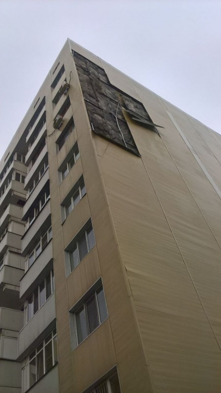 "Это металлический сайдинг, во время вчерашнего ветра он летал по двору. Никого, к счастью, не задел. Но нам пришлось быстро убирать подальше свои автомобили. Восстановительные работы пока не ведутся", - рассказал жилец дома.