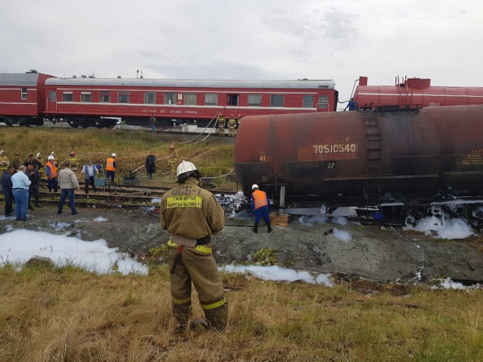 "Цистерна не перевернулась, она осталась на рельсах. С рельсов сошла пара колес, в результате сорвало сливной клапан. 45 тонн удалось спасти. Мы сразу приняли все меры по предупреждению возгорания дизтоплива. На место прибыл пожарный поезд и были вызваны экологи", - сообщил начальник Департамента по ЧС Костанайской области Талгат Какимов.