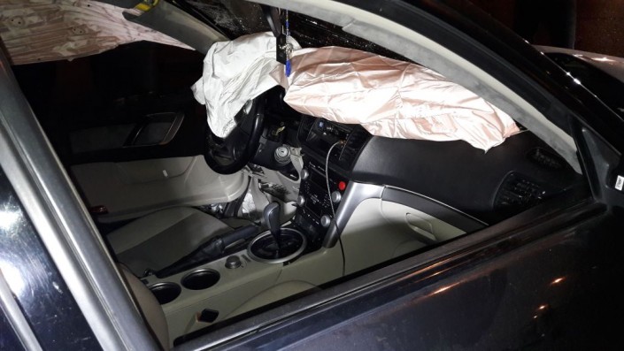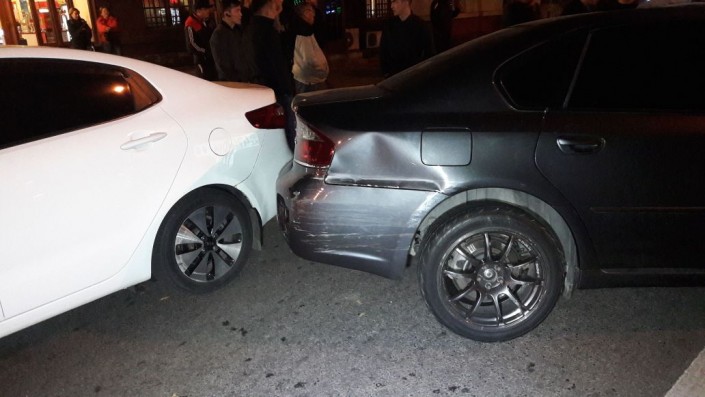 Авария произошла на пересечении улиц Толе би и Аносова. Со слов очевидцев, автомобили Subaru и Nissan двигались в восточном направлении по Толе би. По всей видимости, водитель Nissan решил повернуть на улицу Аносова и врезался в Subaru. Водитель Subaru не справился с управлением и на полном ходу влетел в бетонный столб, после чего его отбросило в припаркованную Kia.
