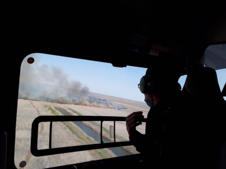 "Сегодня, 5 мая, в связи с появлением задымленности и запаха гари в Атырау наши сотрудники совершили облет на вертолете Eurocopter ЕС-145 для выявления очагов пожара. В ходе воздушной разведки было установлено, что на прибрежной территории Каспийского моря в устье канала "Айсан" горит камыш на площади примерно 15-17 гектаров", - сообщили в пресс-службе ДЧС.
