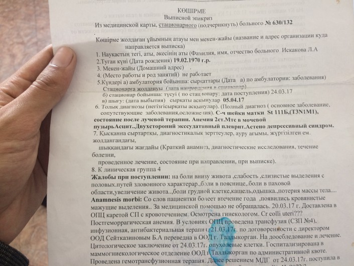 "(...) Даже животные так не поступают с сородичами. Три года мы искали ее и не смогли отыскать. Когда она впервые зашла домой, я, родной брат, не смог узнать свою сестру, - эмоционально вспоминает Бауыржан подробности того дня. - Одна кожа да кости. Зашла как живой труп. Мы сразу же обратились в медучреждение. Но столкнулись с проблемой отсутствия документов. Врачи пошли нам навстречу и оказали услуги. Но драгоценное время упущено, у нее рак 4-й степени. Я теперь вынужден ждать дня, когда ее страдания закончатся. Это сейчас она лежит спокойно. Ночью воет как волк от боли в промежности. У нее рак шейки матки".