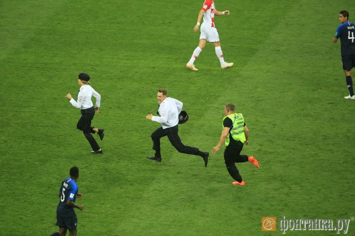 По данным портала "Фонтанка.ру", это были участники панк-группы Pussy Riot, на поле выбежали они. Акцию они назвали "Милиционер вступает в игру". "Им удалось перебраться через ограждения, прорваться сквозь стюардов и выбежать на поле. Возможно, им помогло то, что они были одеты в униформу. Поймать их удалось лишь в центре поля. Уносили их буквально на руках", - отмечает издание.