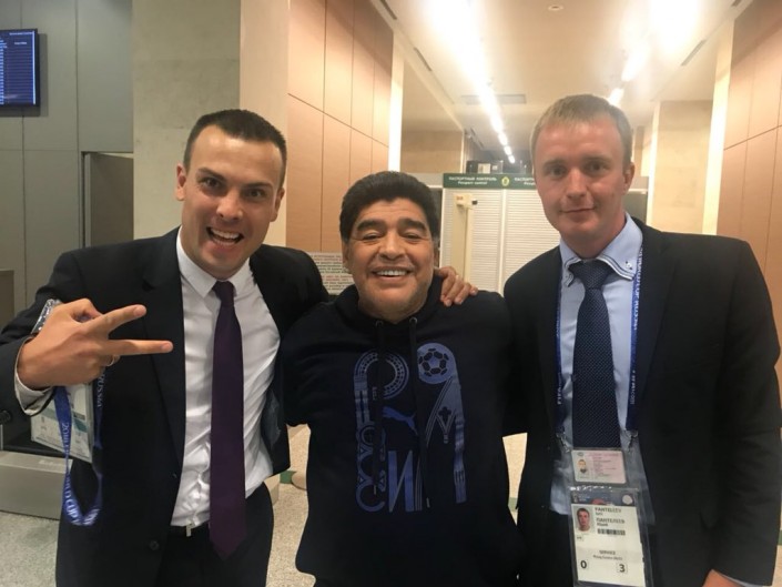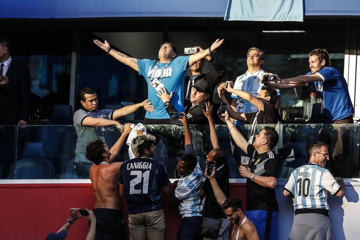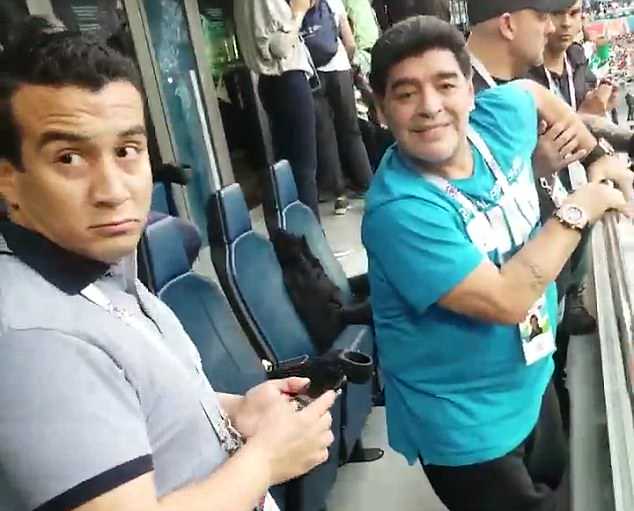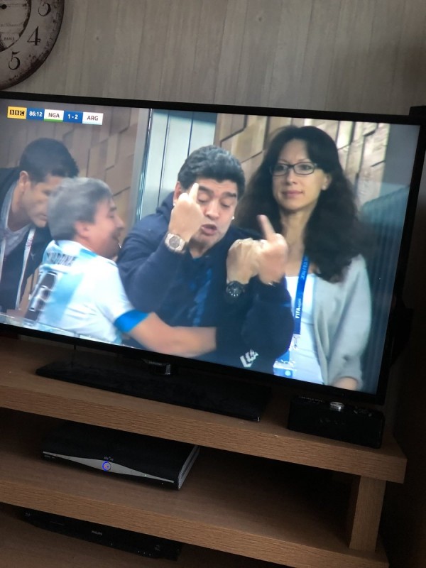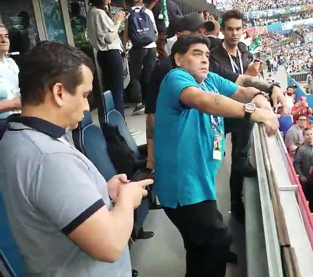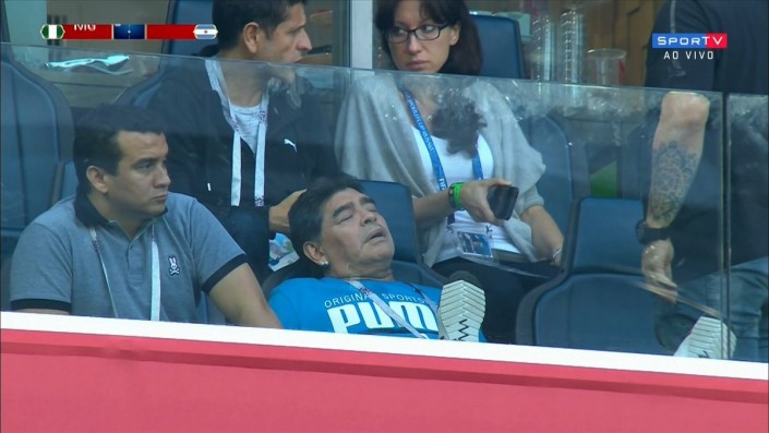Марадона наблюдал за матчем из VIP-ложи, и во время телетрансляции камеры неоднократно показывали его бурные эмоции и реакцию на происходящее. Футболист вел себя вызывающе и порой неадекватно. Перед игрой Марадона станцевал с болельщицей сборной Нигерии. А после второго гола аргентинцев показал неприличный жест.