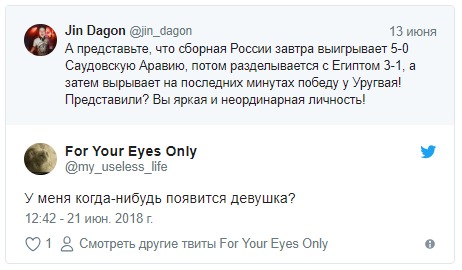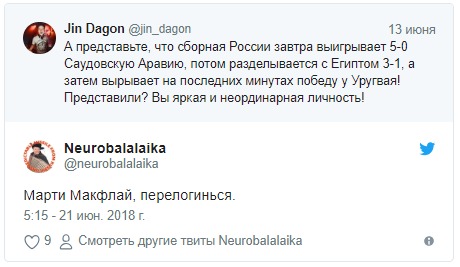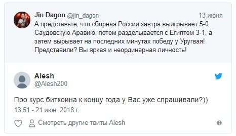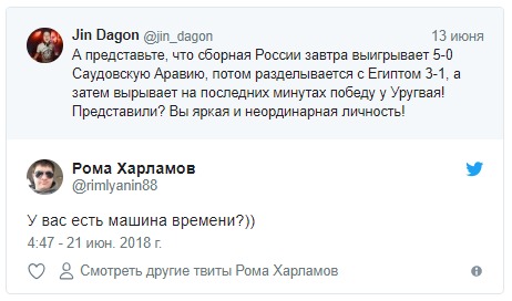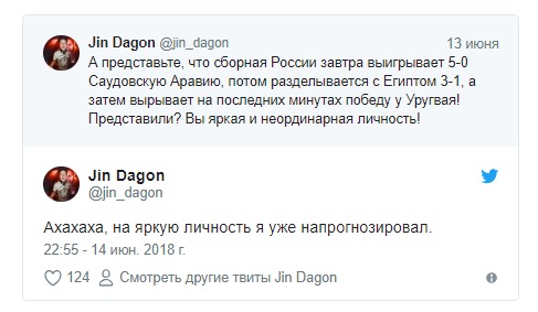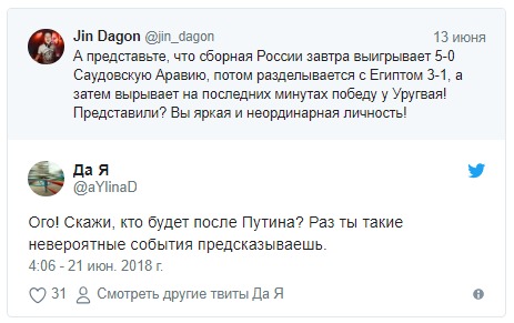 "А представьте, что сборная России завтра выигрывает 5-0 Саудовскую Аравию, потом разделывается с Египтом 3-1, а затем вырывает на последних минутах победу у Уругвая! Представили? Вы яркая и неординарная личность!" - отметил он за день до официального старта турнира.