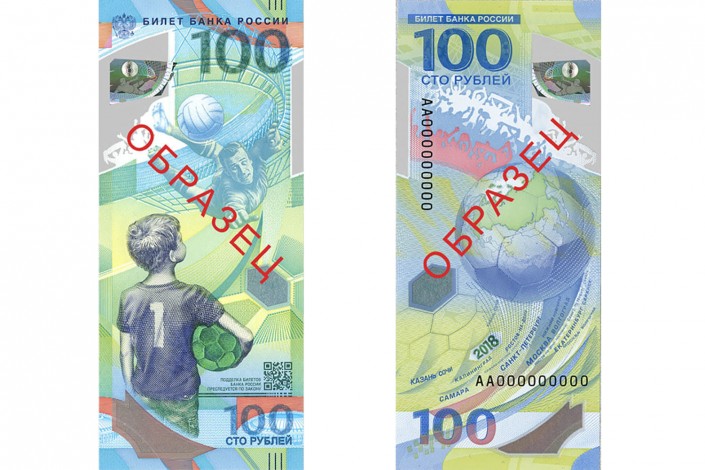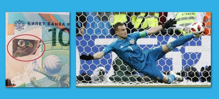 Центральный банк России в мае этого года в преддверии чемпионата мира по футболу ввел в обращение памятные банкноты номиналом 100 рублей. На купюрах изображен силуэт футболиста, в падении отбивающего мяч левой ногой.