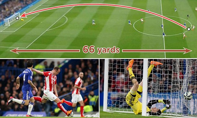 Все произошло в субботнем матче 31-го тура чемпионата Англии. На 44-й минуте игры при счете 1:0 в пользу "Челси" шотландский хавбек, увидев, что голкипер далеко вышел из ворот, пробил с расстояния в 66 ярдов (около 60 метров). Куртуа успел в прыжке зацепить мяч, но снаряд все же попал в сетку.