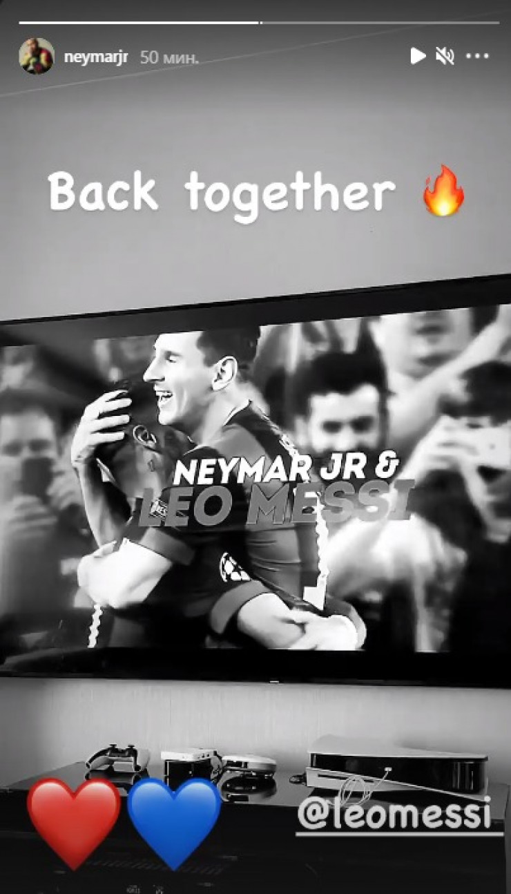 Бразильский нападающий "ПСЖ" Неймар поприветствовал своего бывшего одноклубника по "Барселоне". Неймар выложил в Instagram фрагмент видео с Месси, подписав его: "Снова вместе" и отметив аккаунт аргентинца.