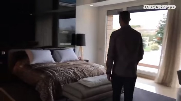 Португальский форвард "Реала" провел экскурсию по дому. Показал свою просторную спальню, где, по его словам, он проводит по полдня. "Спальня занимает одно из важных мест в жизни. Мне нужно хорошо отдыхать. Чтобы выступать на высоком уровне, необходимо высыпаться, восстанавливать силы", - пояснил футболист. Всего в одноэтажном особняке, стоимостью 7,1 миллиона долларов, семь спален и восемь ванных комнат.