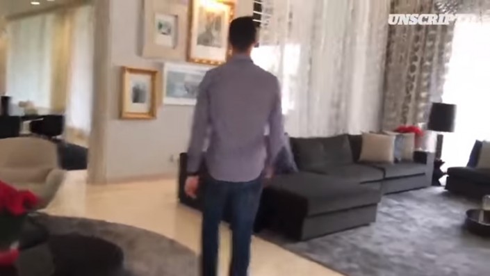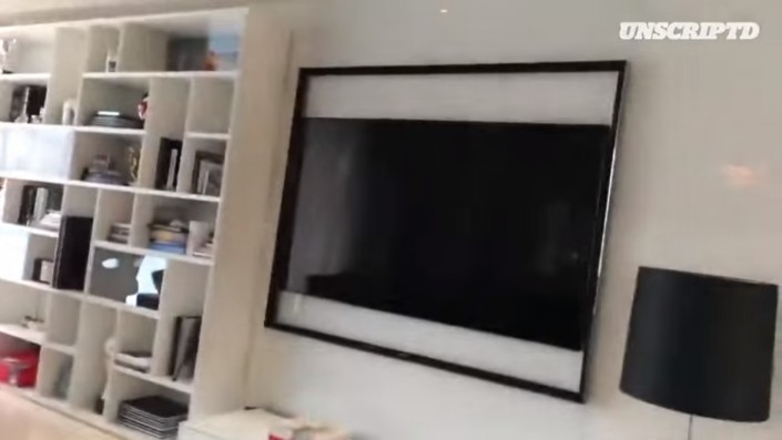 Затем Роналду демонстрирует гостиную с большим телевизором, по которому он обычно смотрит футбольные матчи.