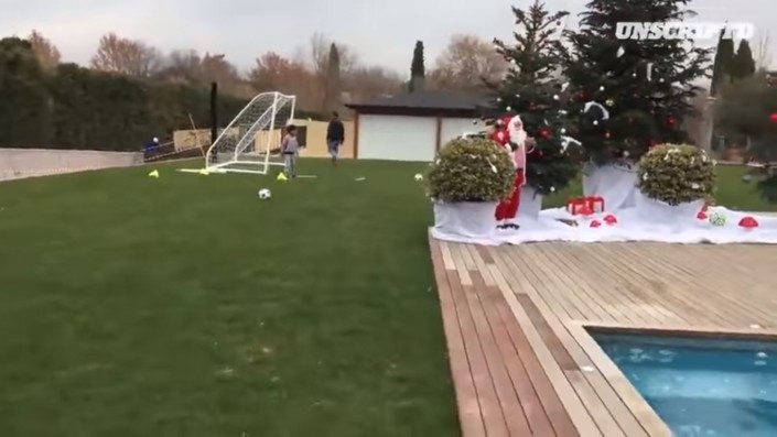 После этого футболист выходит наружу, к бассейну и мини-футбольному полю. "Мы тут в футбол играем. На Рождество привезли большую елку. Желаю всем счастливого Рождества и Нового года, будьте счастливы!", - сказал футболист.