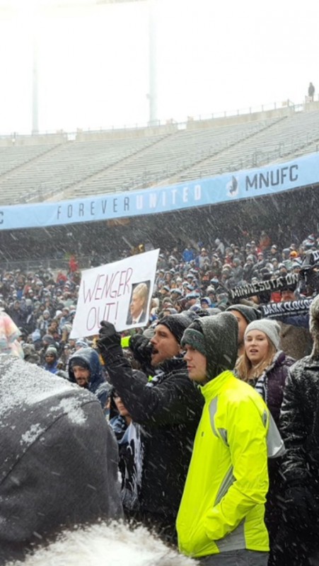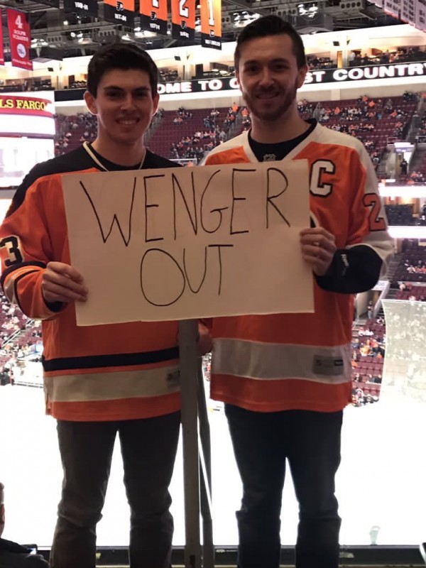 Среди держащих плакат Wenger Out можно заметить известного комментатора Евгения Акманова и ведущего программы "Наш футбол.kz" Петра Воликова.