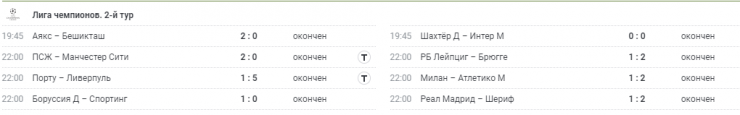 В группе B "Ливерпуль" одержал разгромную победу со счетом 5:1 над "Порту" в гостях. "Милан" на своем поле уступил "Атлетико Мадриду" со счетом 1:2. Судьбу поединка решил пенальти, назначенный на последних минутах добавленного времени.